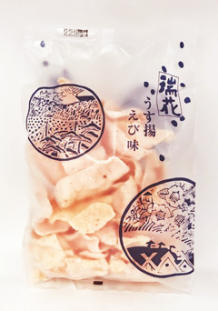 海老を練り込んだ生地をカラッと揚げ、シンプルな塩で味付けした揚げせんべい。海老の香りとお米の風味がマッチして オーソドックスながら「うす揚」の中でいちばん人気があります。